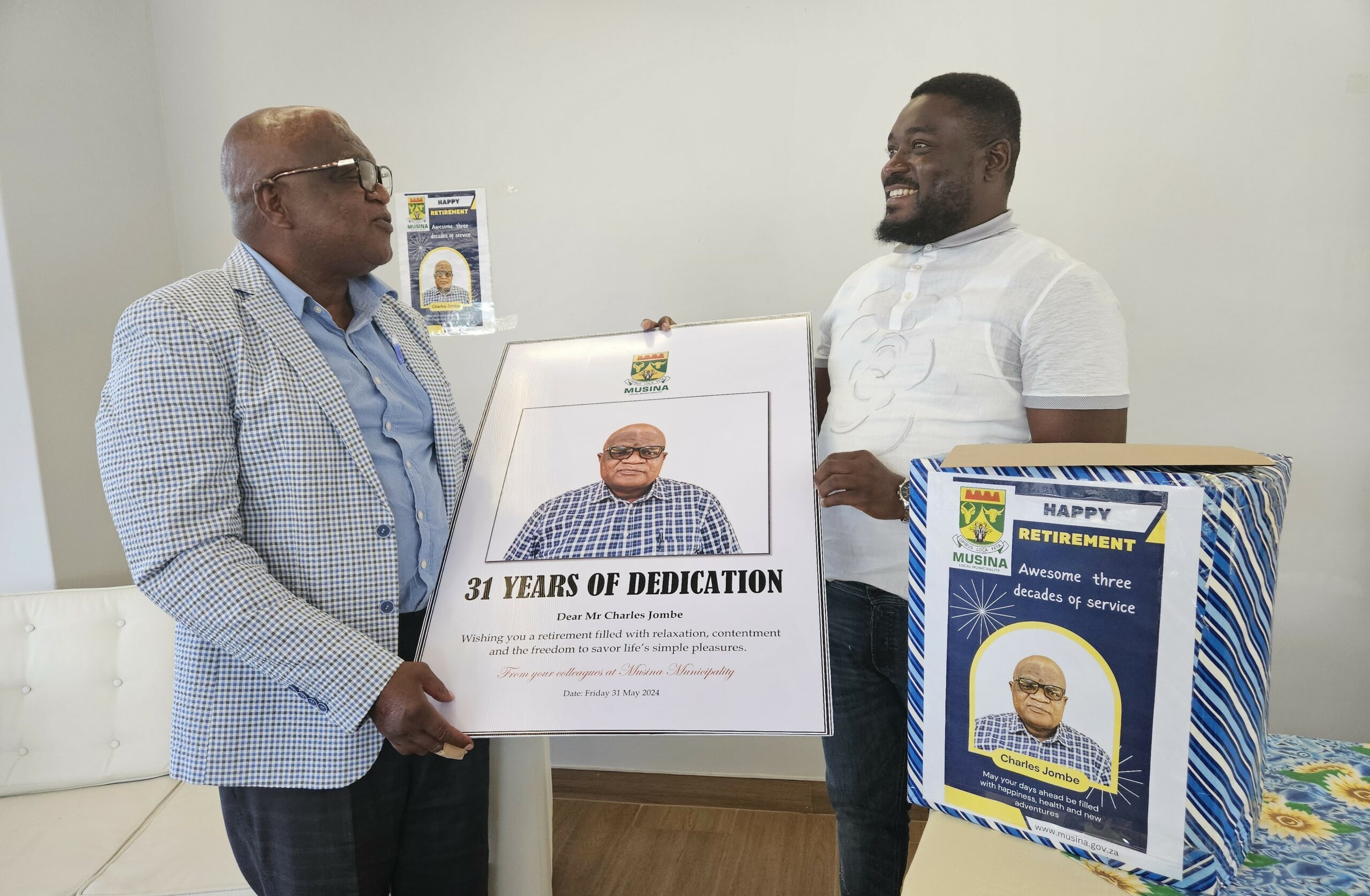We bade farewell to our former Licensing Manager, Mr Charles Jombe as he retires from public service after 31 years of dedication at Musina Municipality. In the photos, Jombe (left) receives tokens of appreciation from Municipal Manager, Mr Nathi Tshiwanammbi in recognition for his hard work and dedication. Tshiwanammbi thanked Jombe for his contributions and wished him well in his retirement.